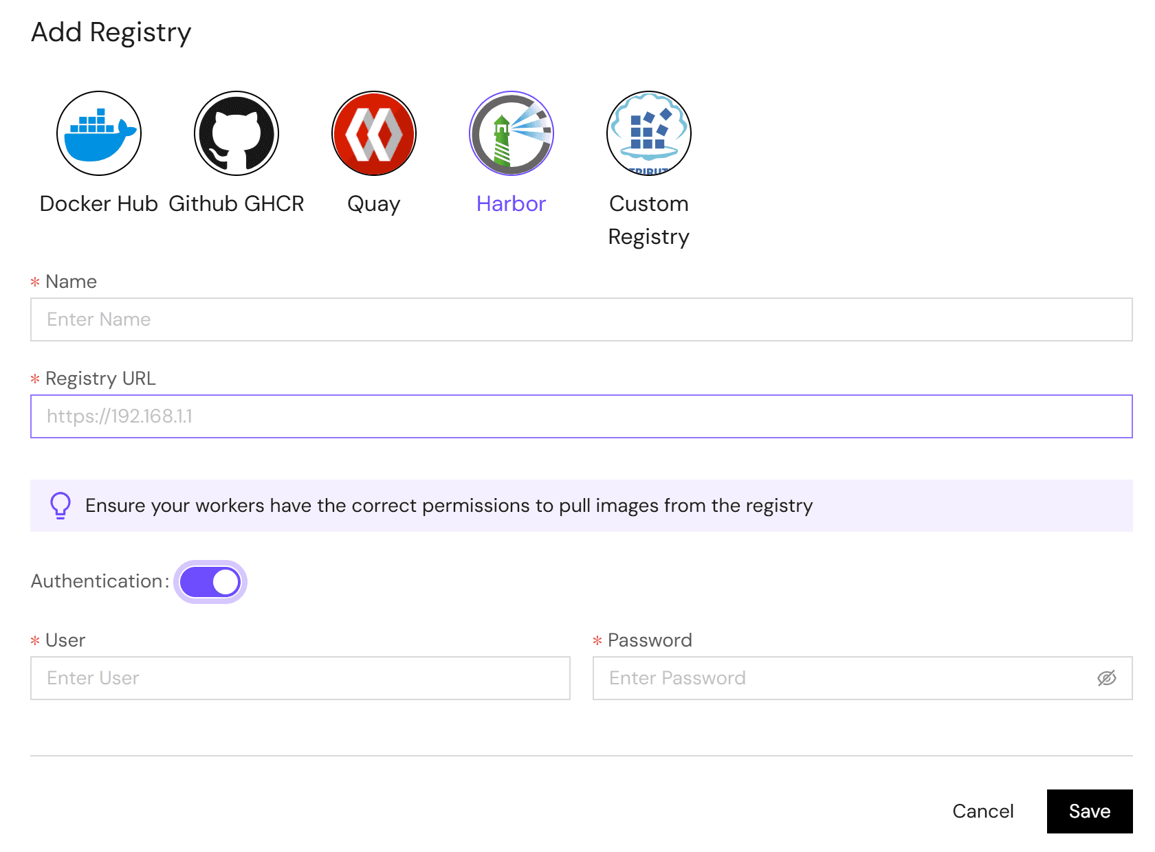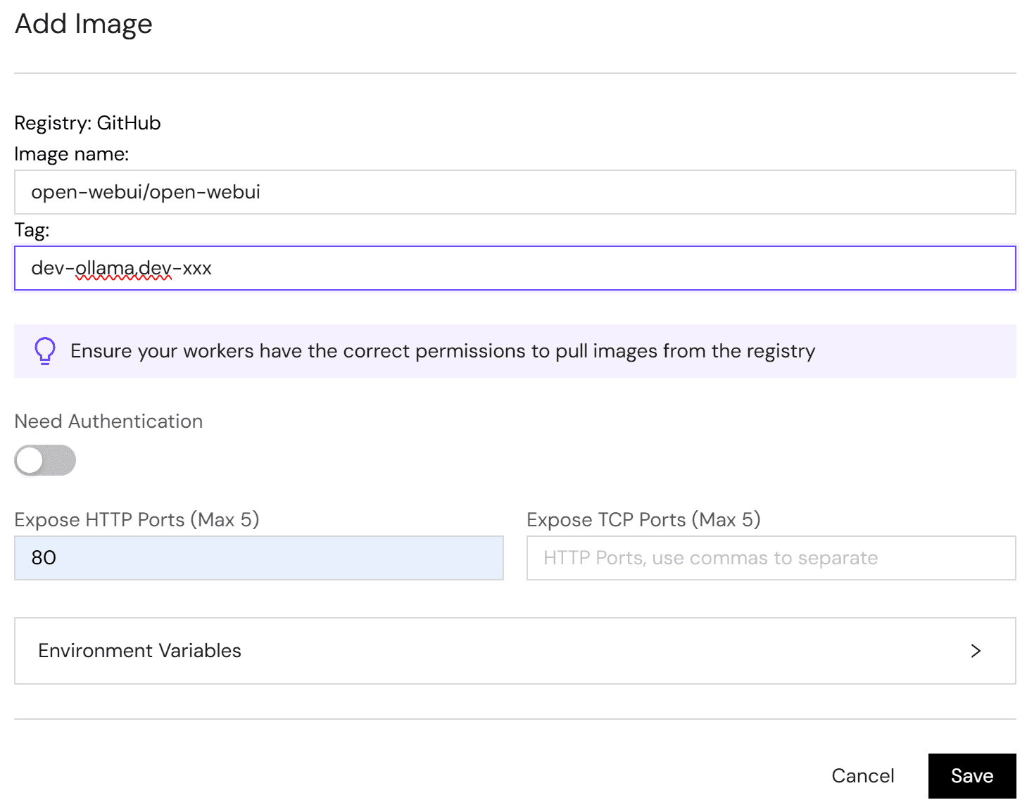 4. If your image is a private image, please turn on the "Need Authentication" button. Note: It requires that your image repository has password authentication enabled.