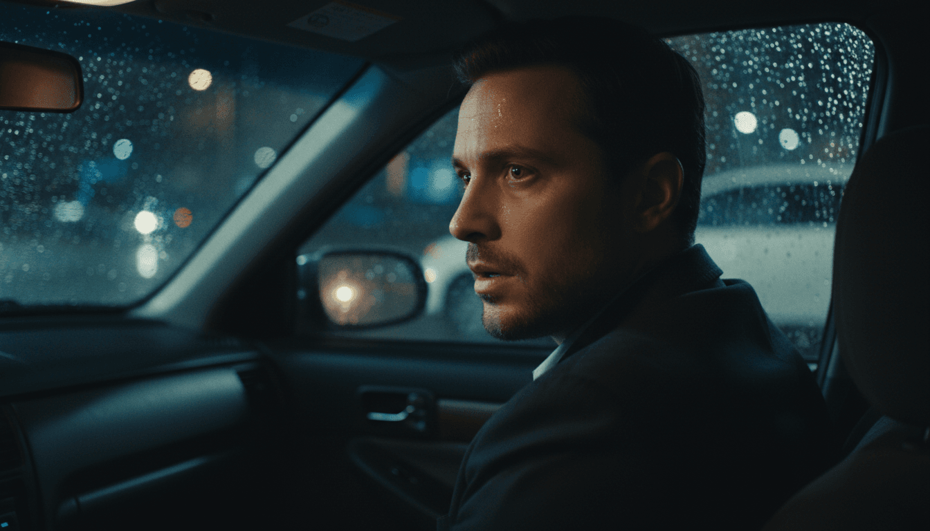 🔆 Focus: Micro-expression management and emotional consistency in low light. 🗺️ Prompt: Visuals: Cinematic texture, realistic style. Night, interior car scene. Dim lighting, only neon lights from outside intermittently sweep across the interior. A male detective in his 30s sits in the passenger seat. Shot: Face close-up. Action: At the start, sweat drips down his face, looking anxiously out the window. Then, he abruptly turns to look directly at the camera and says: "Don't look back, just drive." Audio: Muffled thunder and rain outside, clear engine idling hum inside.