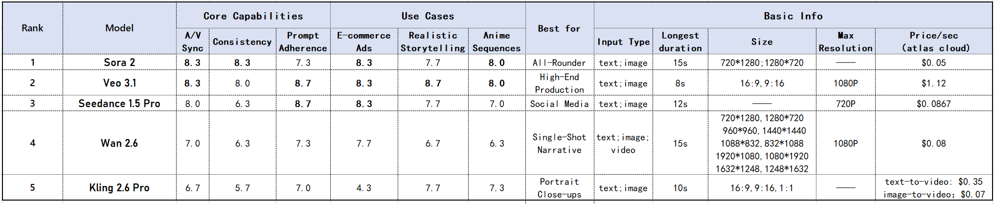 📝 Verdict: Sora 2 and Seedance 1.5 Pro produced videos with commercial potential, with Sora 2 winning by a nose. Veo 3.1 showed off its "premium" status—despite the mistimed VO, the sound design and understanding of complex instructions (manufacturing process) proved why it's expensive. Wan 2.6 and Kling 2.6 Pro need major rework. Want the Logo right? Pick Wan 2.6. Want pretty visuals? Pick Kling 2.6 Pro.