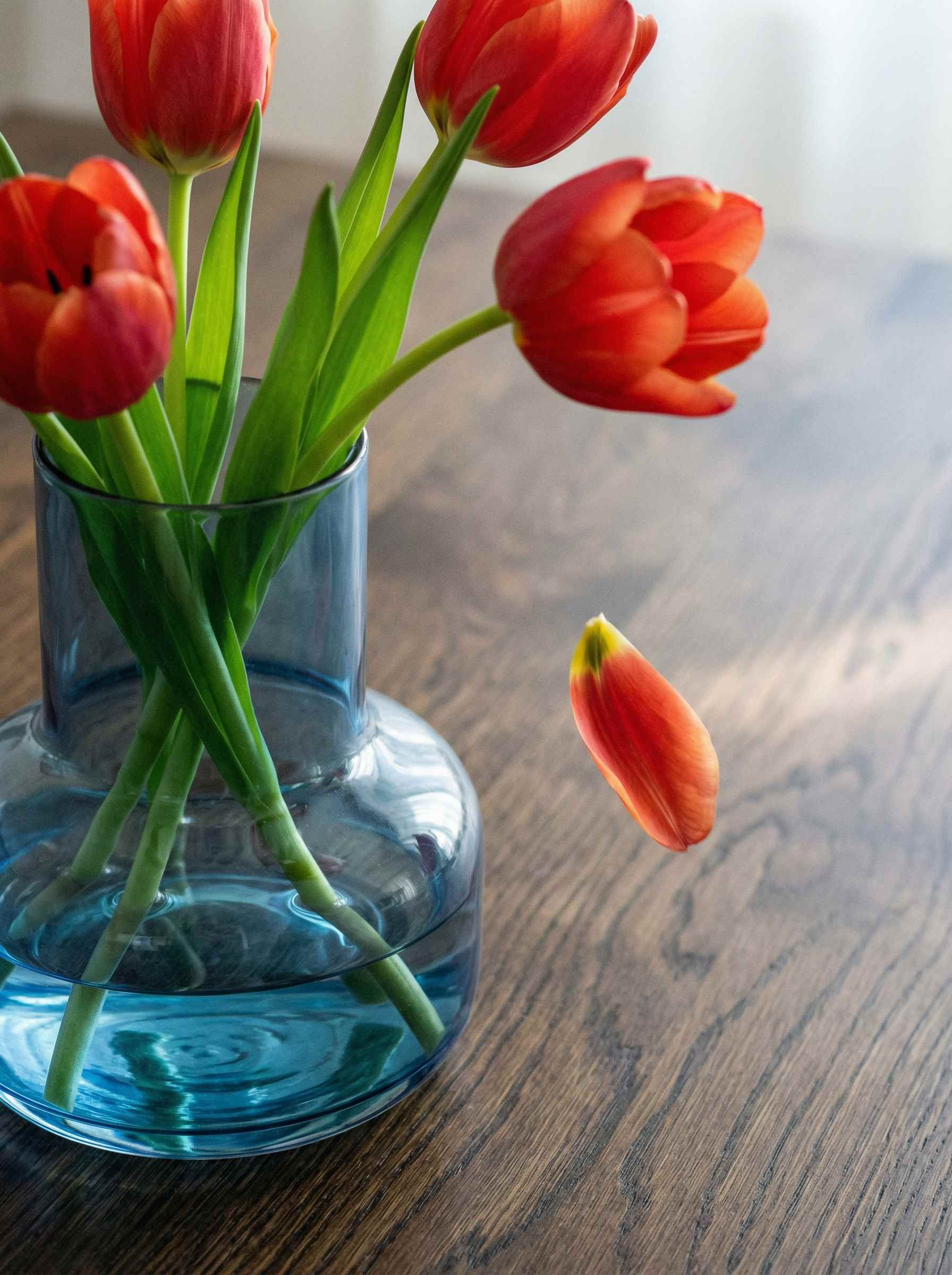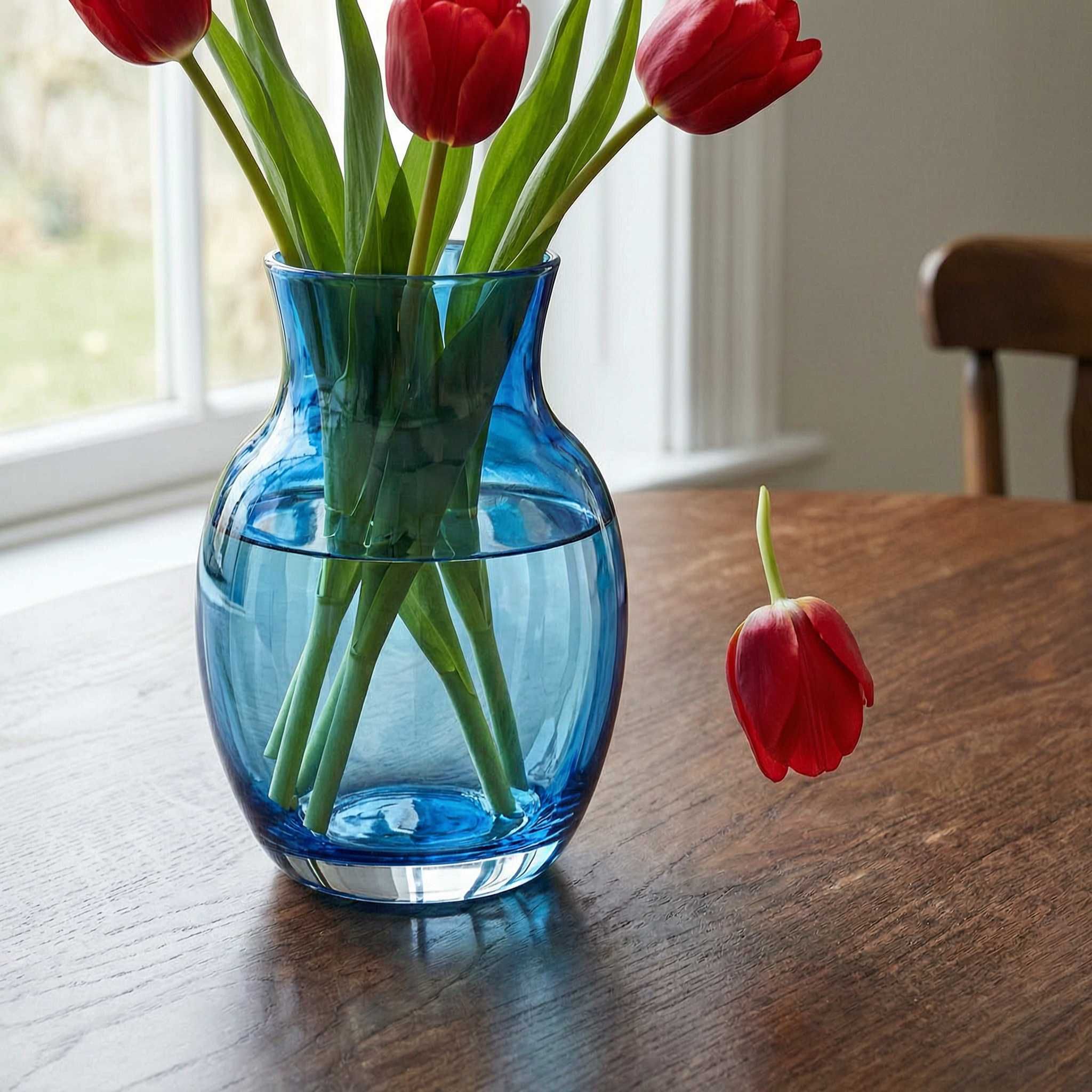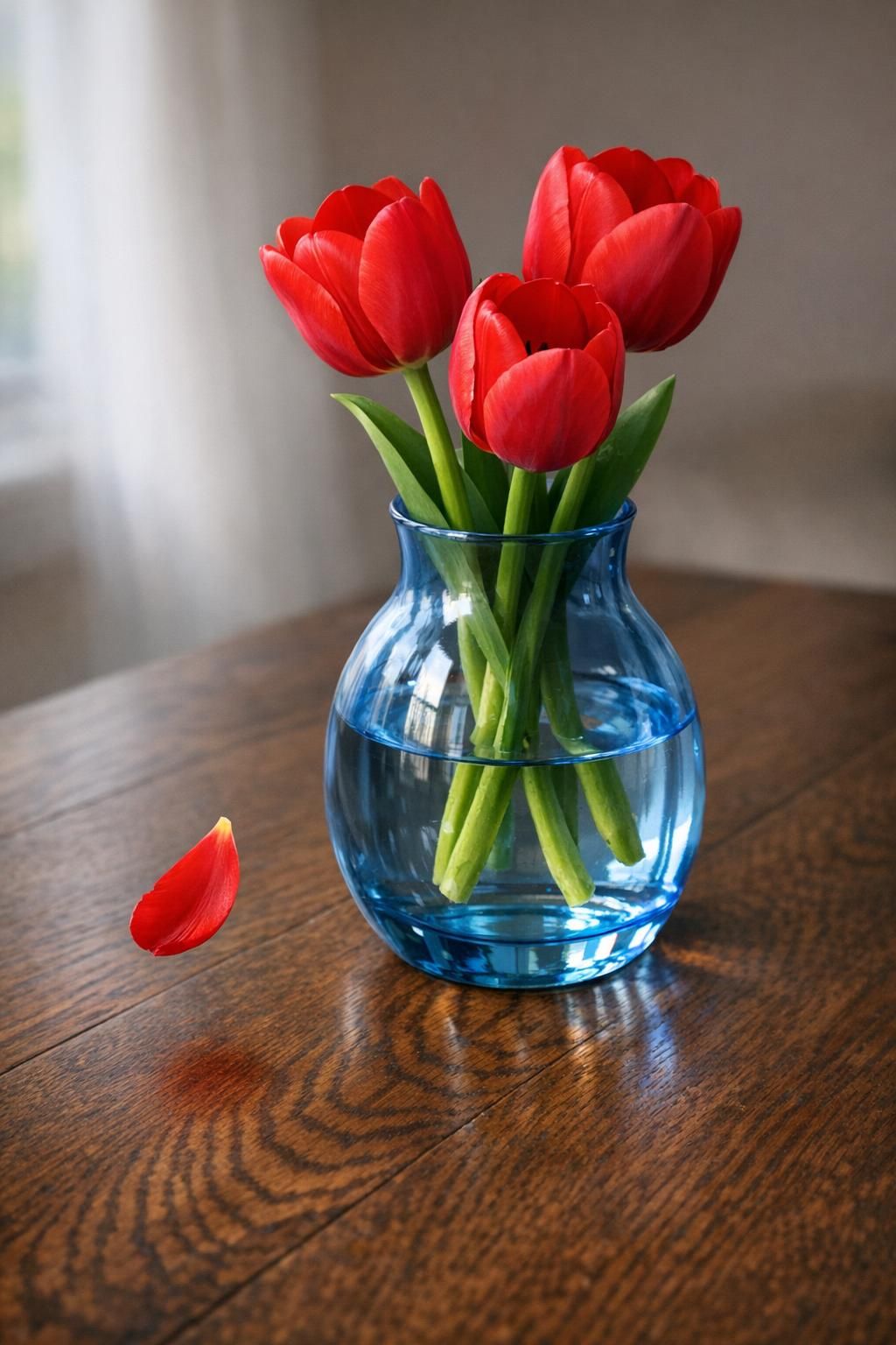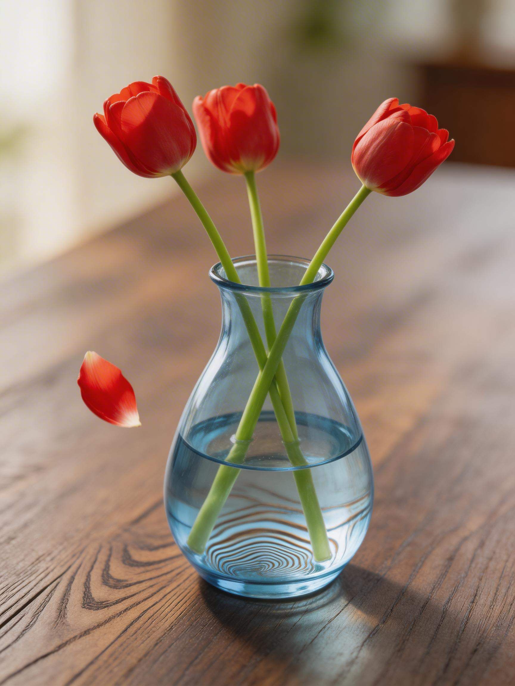 The Test Prompt: "A photorealistic close-up shot of a blue, semi-transparent glass vase sitting on a dark oak wooden table. Inside the vase, there are exactly three red tulips with vivid green stems. A single tulip petal is captured in mid-air, falling downward toward the table surface. The glass must clearly show the refraction of the wooden grain of the table through the base, and the lighting must be soft natural morning light."