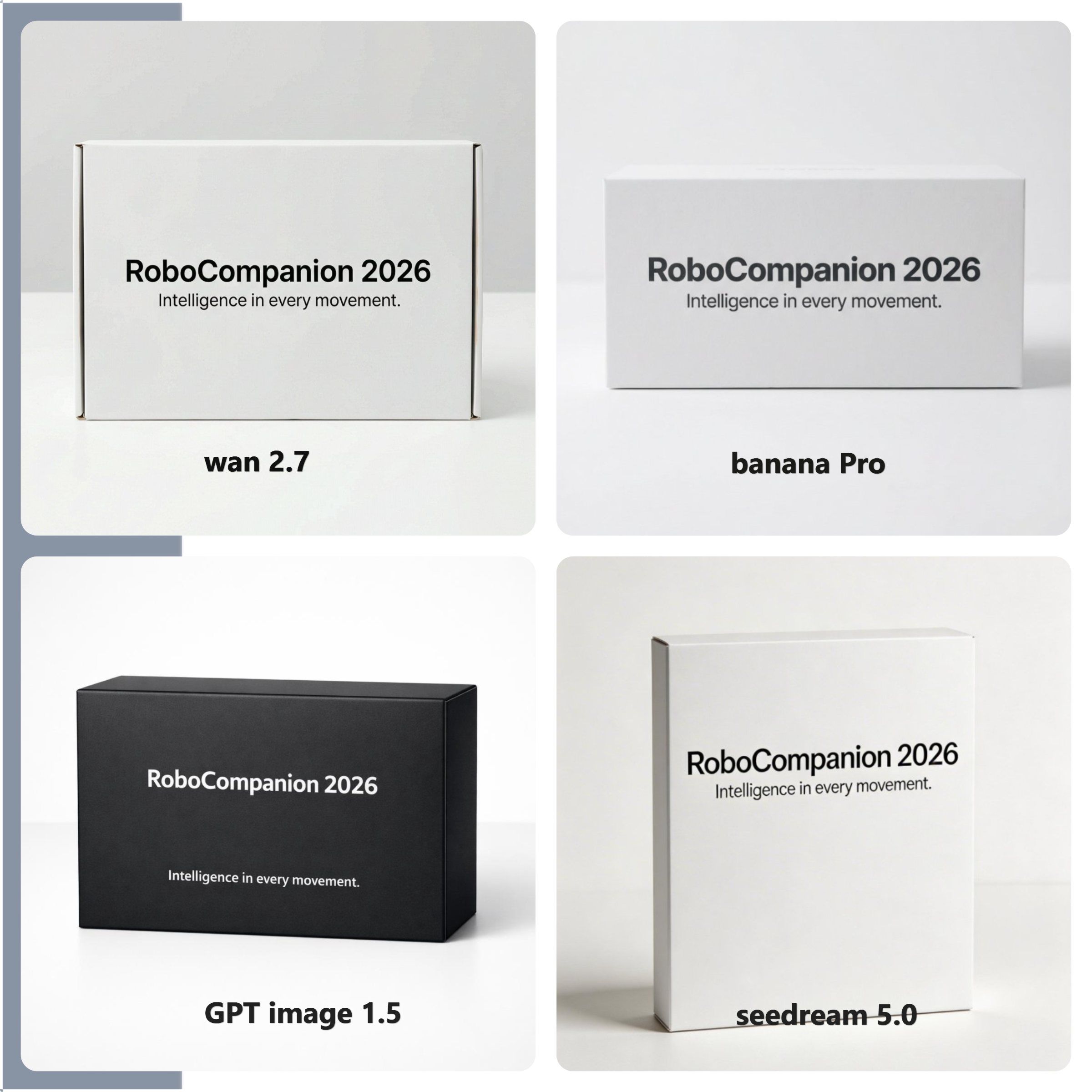 - Wan 2.7 (The Precision Specialist): Achieved a perfect score. Its rendering of the "RoboCompanion 2026" text was crisp, perfectly kerned, and maintained the strict minimalist aesthetic requested. It is currently the model to beat for technical commercial design.
