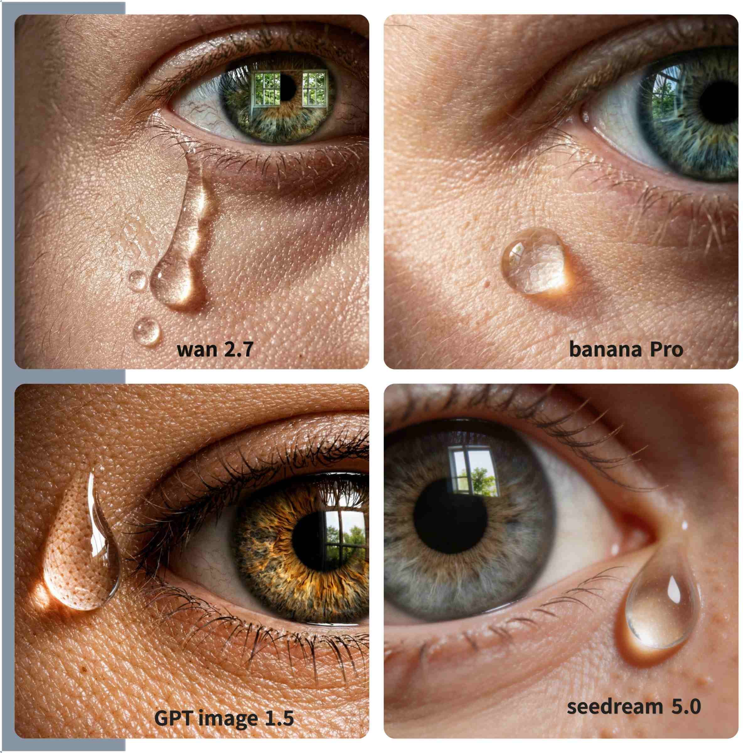 - Banana Pro: This model most successfully captured the "sharp, directional side-lighting." The shadowing under the skin pores and the vellus hairs is the most pronounced and realistic here. The reflection in the cornea is precise, rendering the miniature window and the green tree with the least amount of chromatic aberration. The tear drop is slightly more "static" or "beaded" than the "rolling" movement requested. The clear winner for technical macro realism and lighting fidelity.