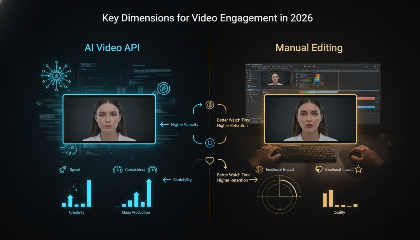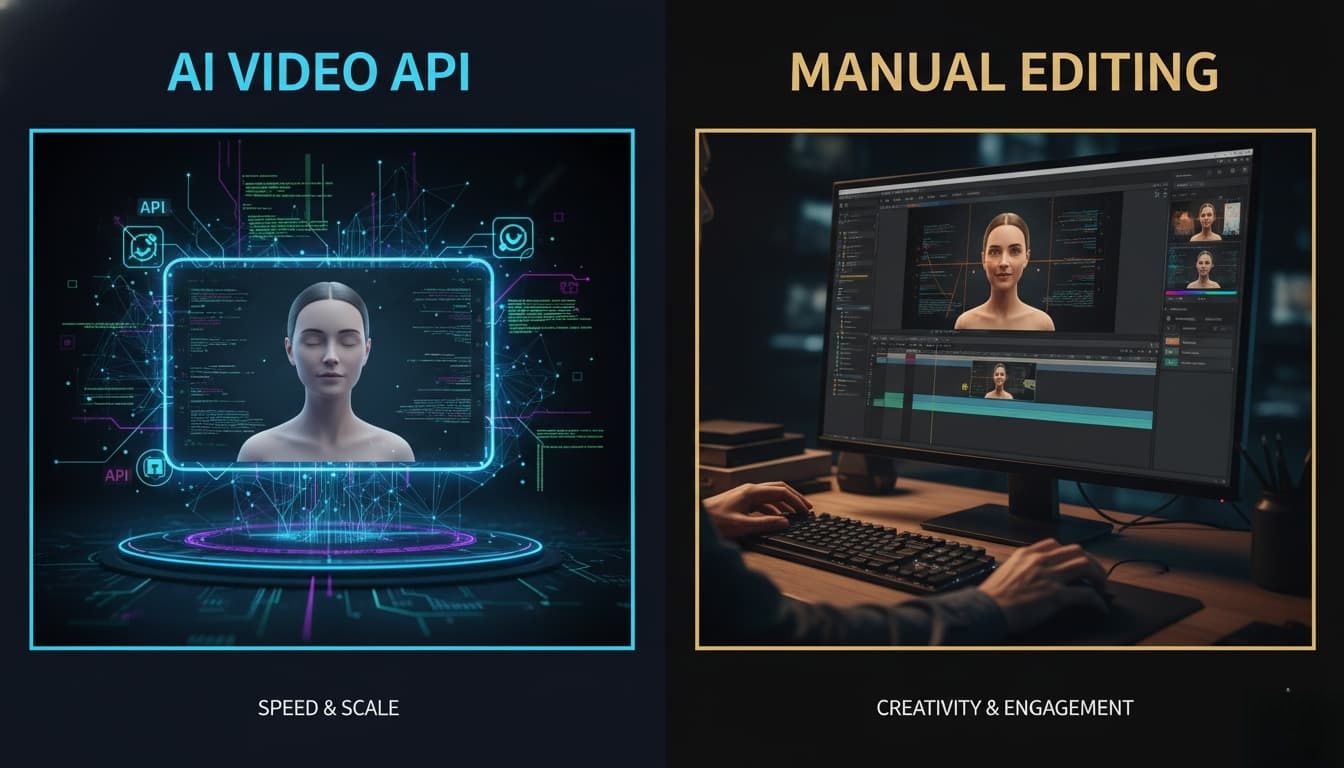 AI video APIs clearly win for sheer speed, rapid A/B testing, and short-form volume. But manual editing still holds the edge for deep emotional storytelling. Honestly, the highest engagement in 2026 comes from a hybrid approach—using APIs for daily personalized clips and human editors for flagship brand films.