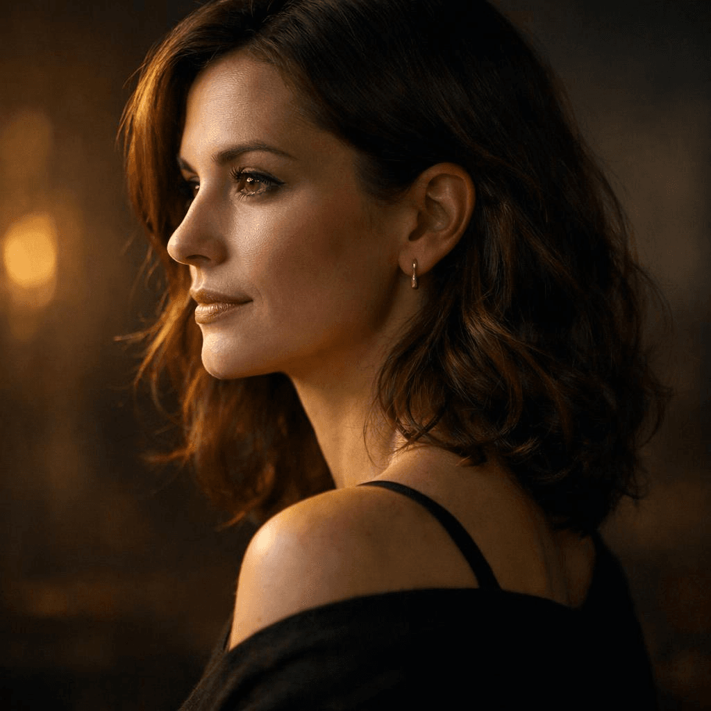 A portrait of a woman, side lighting from the left, soft shadows on the right side of the face, subtle ambient light from the background
