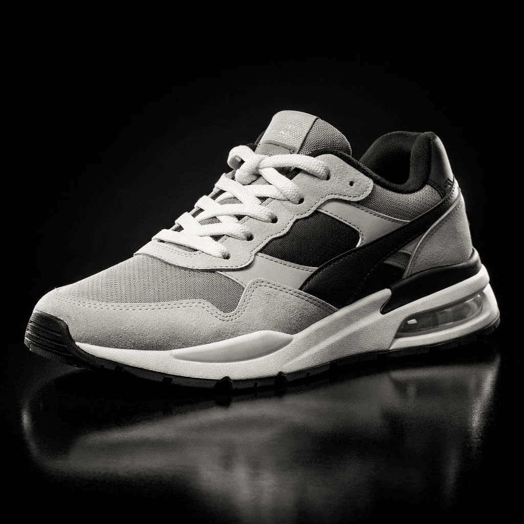 Product shot of a sneaker, three-point lighting setup, strong key light, soft fill light, subtle rim light separating the product from a dark background