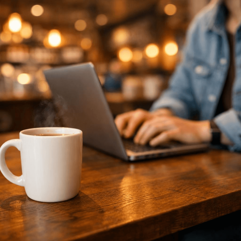 A coffee cup on a wooden table (foreground), a person working on a laptop (midground), a softly blurred café interior with warm lights (background)