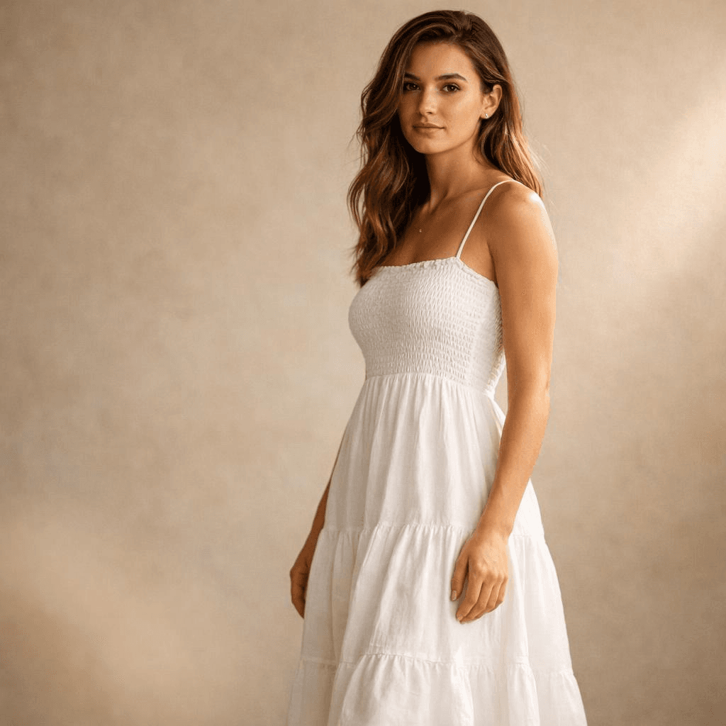 A female model wearing a white summer dress, clean background, studio lighting, high detail, e-commerce style