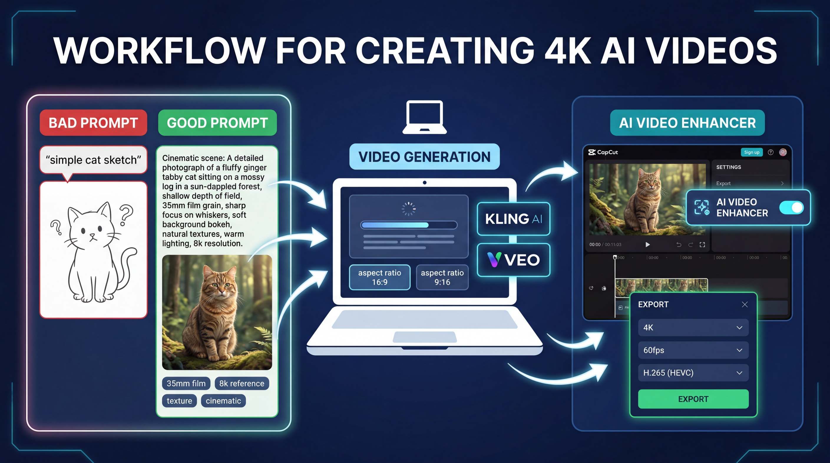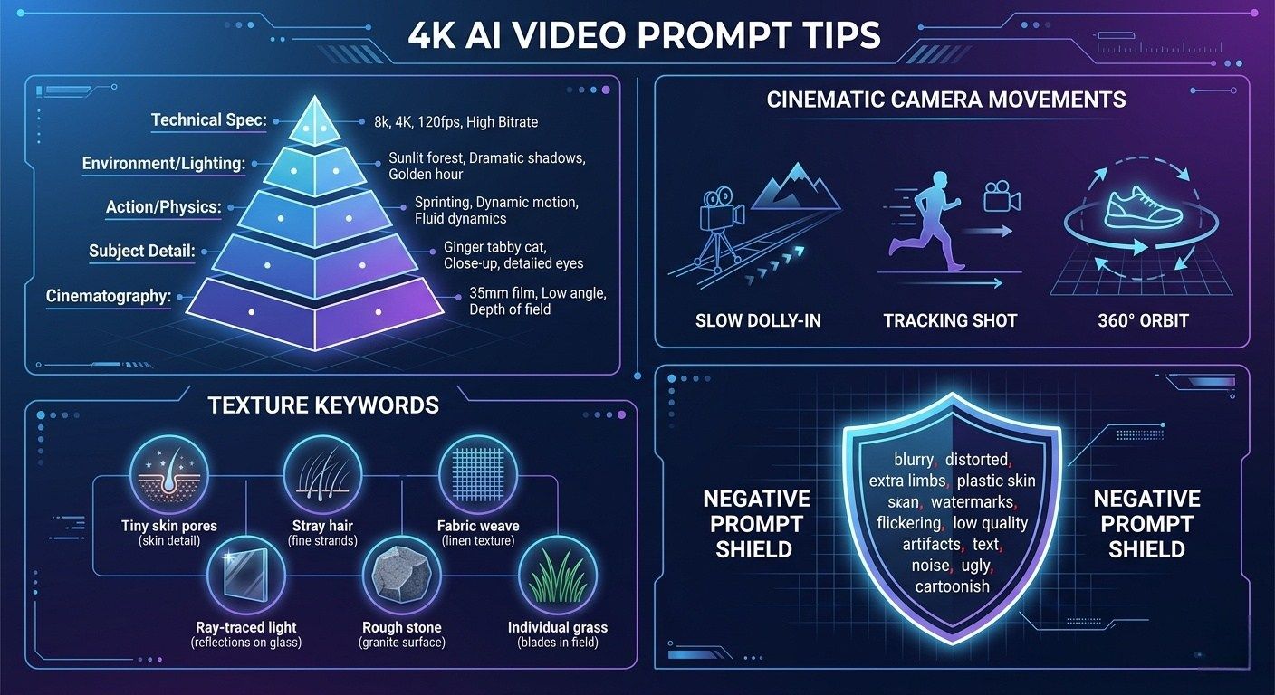 To get the most out of a 4K AI video generator free workflow, you need to write prompts that provide the "texture" necessary for an upscaler to work effectively. Here are the essential prompting techniques to ensure your high resolution AI video free projects look professional.