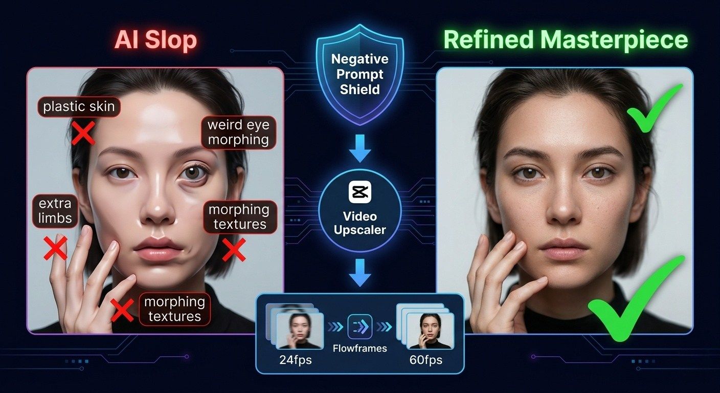 If your tool (like Kling 3.0 or Wan 2.6) supports negative prompts, use them to block the "AI Slop" look. This is the best free video enhancer for AI clips strategy because it prevents errors before you upscale.