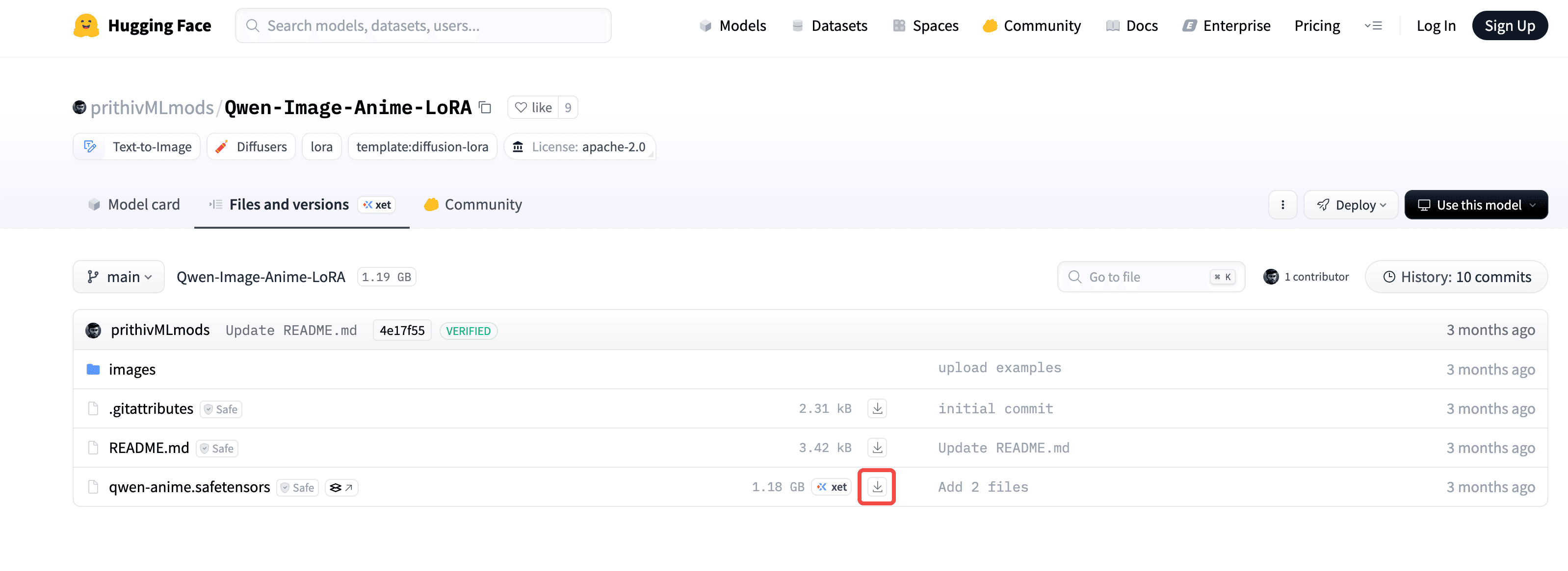 Например, на странице модели prithivMLmods/Qwen-Image-Anime-LoRA прокрутите вниз по Model Card, чтобы найти дополнительные детали, такие как инструкции по использованию модели и точное необходимое триггерное слово.