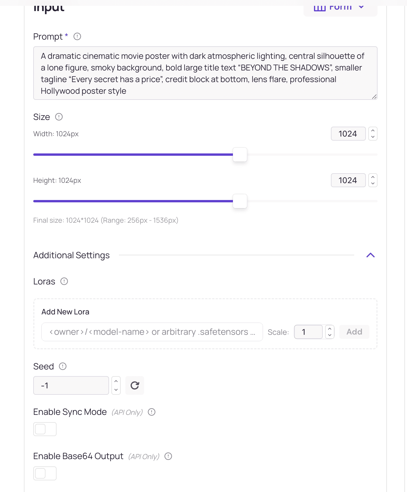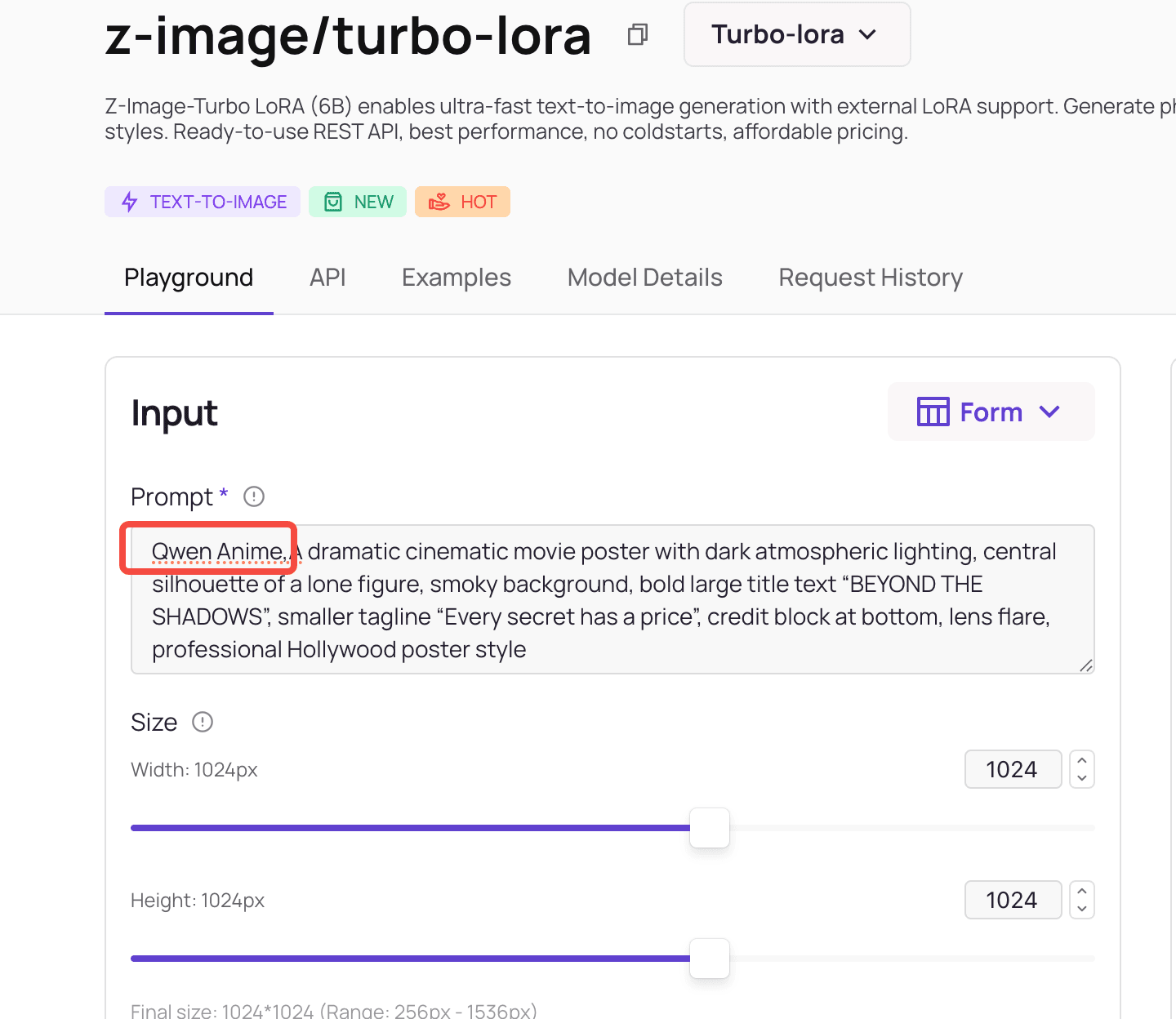 На странице Playground модели вы найдёте поле ввода промпта для ввода вашего промпта, а также раздел loras для добавления модели LoRA.