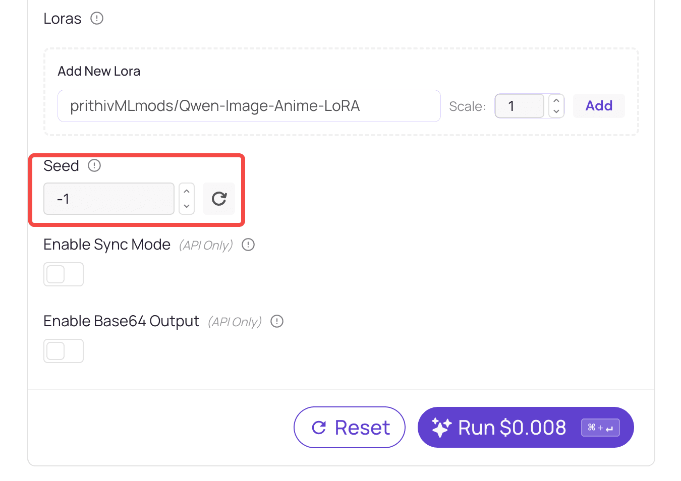 Затем в поле loras, в path введите prithivMLmods/Qwen-Image-Anime-LoRA или его URL, и оставьте scale равным 1.