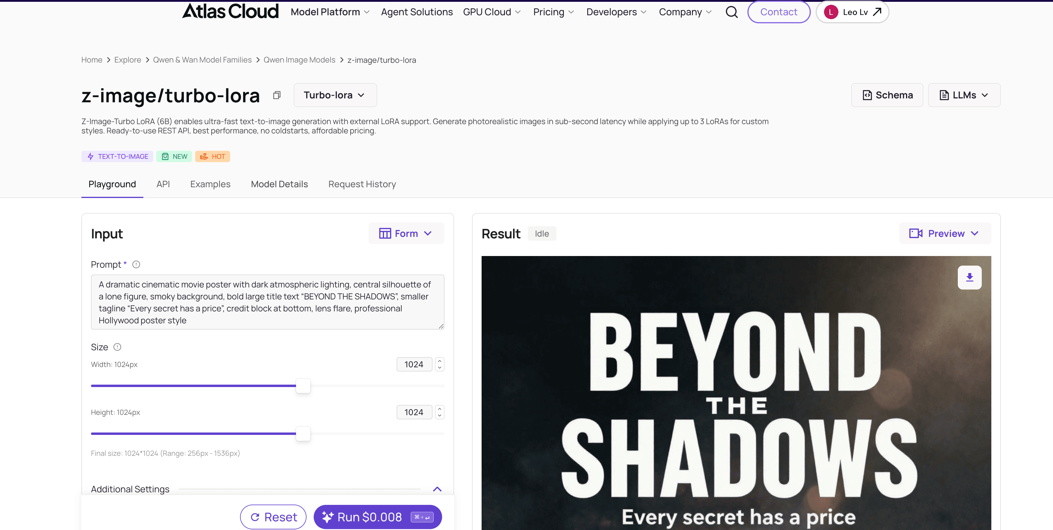 Затем переключитесь на Atlas Cloud и откройте модель atlas-cloud/z-image/turbo-lora. Мы используем её для загрузки и запуска этого LoRA.