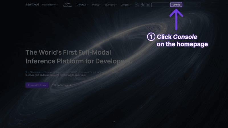 Register an account at Atlas Cloud and go to the API Keys tab in the console. The $1 free credit will be automatically added to your account after registration.