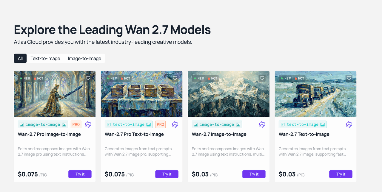 From the Atlas Cloud dashboard, go to the Model Library and search for “Wan 2.7”. Pick the version that matches your needs: standard Text-to-Image (Wan2.7-Image) for static pictures and exclusive features like character customization, Text-to-Image Pro for 4K output, or the Video model for moving content.