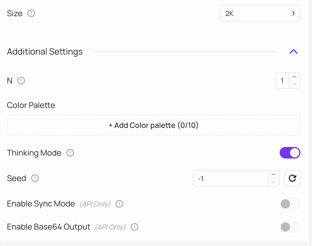 Select your target resolution based on the intended use case. Enable Thinking Mode for complex prompts where accuracy matters more than generation speed. Set a fixed seed value to ensure consistent, repeatable outputs for brand consistency or iterative campaign creation. For Wan2.7-Image, you can also enable the color palette function and upload reference images to extract color schemes.