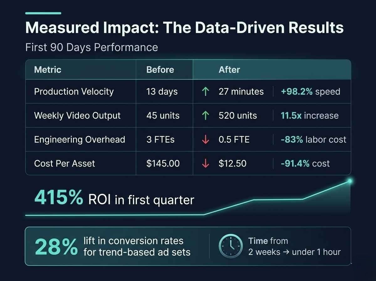 The enterprise realized a 415% ROI in the first quarter. The Delta Speed was the most significant factor: by reducing time-to-market from two weeks to under an hour, the brand was able to capitalize on viral social trends in real-time, resulting in a 28% lift in conversion rates for trend-based ad sets.