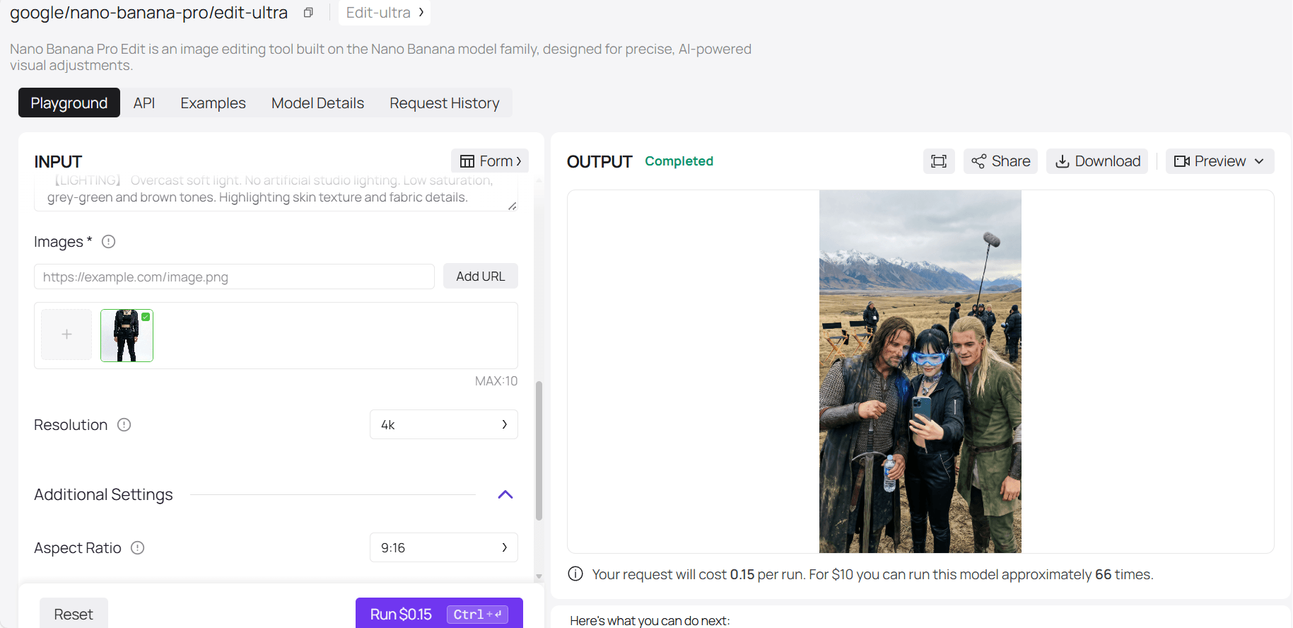 Before we make it move, we need a flawless still image. This step requires a model with exceptional composition and fusion capabilities. NanoBanana Pro (available on Atlas Cloud) is perfect for "placing" your character into a movie scene with photorealistic lighting and texture.