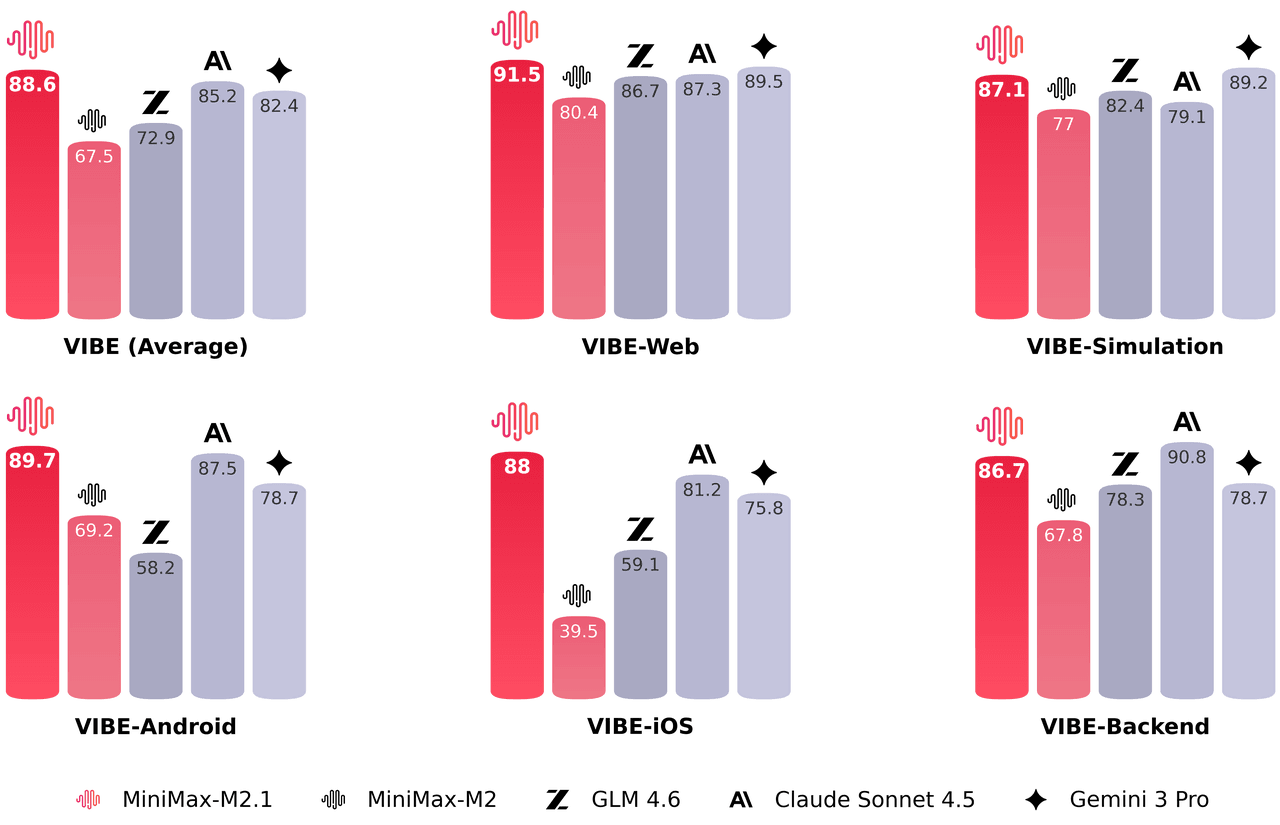 How does the model compare to competitors like Claude Sonnet 4.5? In software engineering benchmarks, MiniMax M2.1 outperforms Claude Sonnet 4.5 in multilingual scenarios and specific domains like code review and test case generation. It closely approaches the performance of Claude Opus 4.5 while offering faster response speeds.