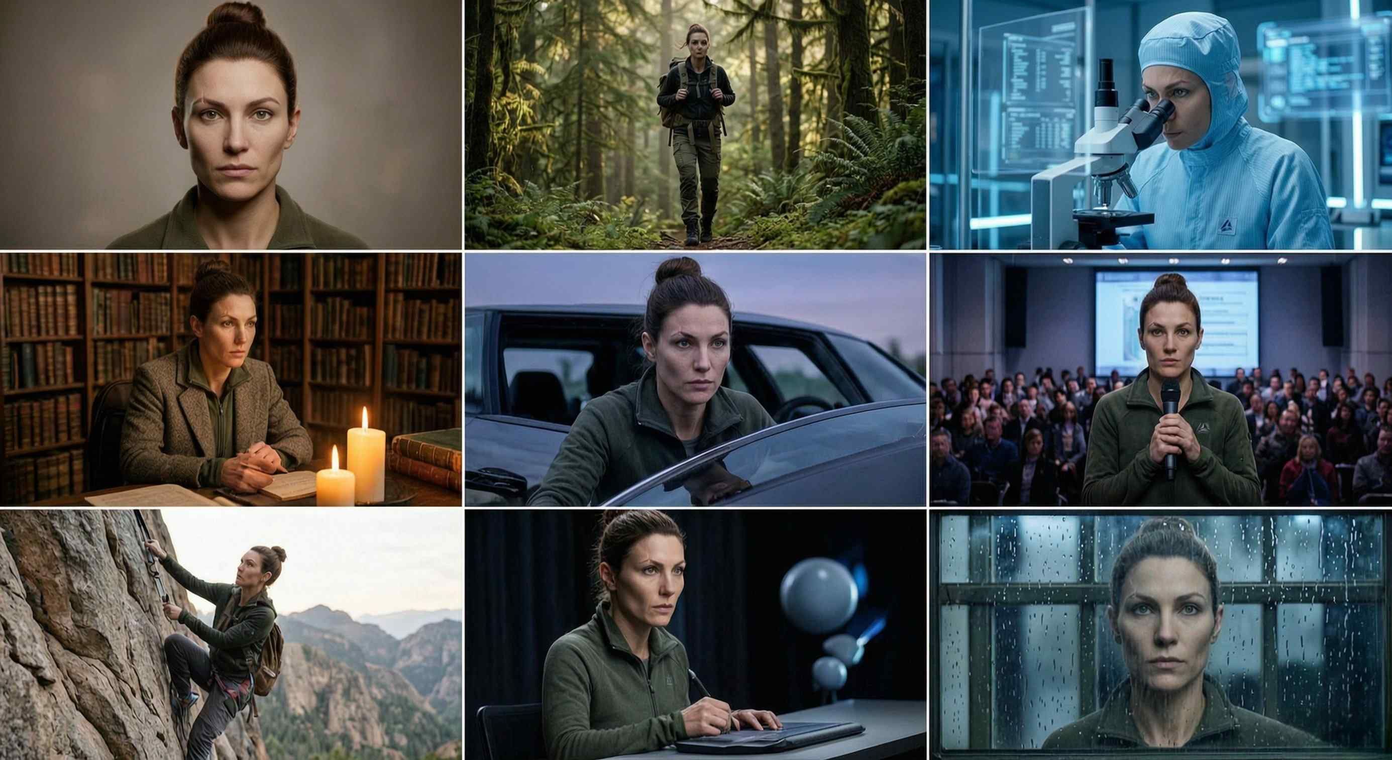 Final: This is an outstanding achievement in AI image generation. Achieving this level of identity consistency—where the character remains clearly the same individual across nine distinct environments, lighting conditions, and camera angles.