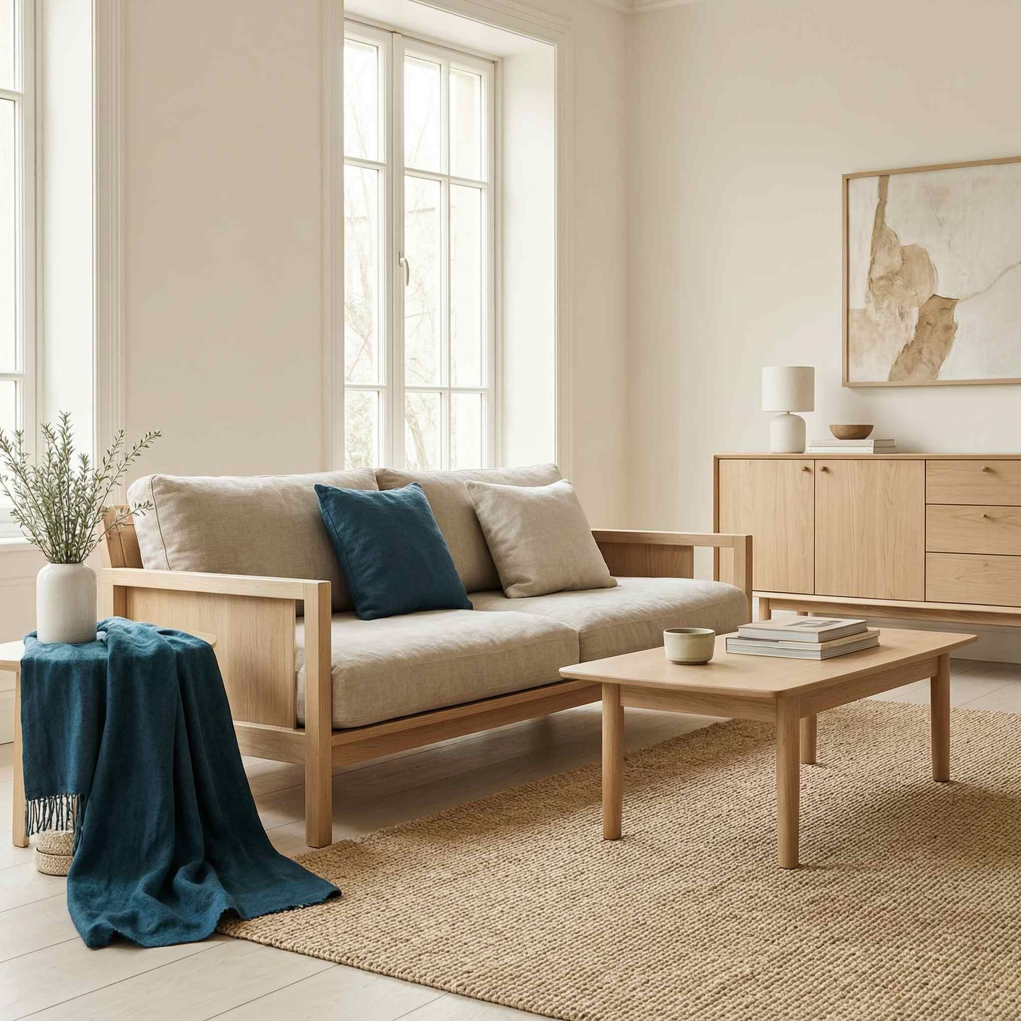My prompt: A minimalist Scandinavian living room with soft, natural light emphasizing the texture of wooden furniture and a linen sofa. Color palette: #EAE0D5 (50%), #C6AC8F (30%), #5E503F (15%), #22333B (5%). High-end interior photography, clean composition, cozy and airy atmosphere