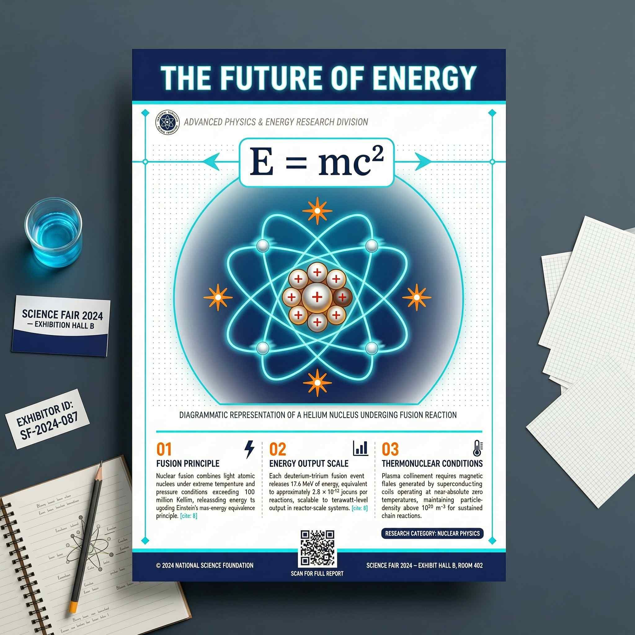 My prompt: A professional infographic poster for a science fair, featuring a central illustration of an atom. The background includes a clean white layout with the header 'THE FUTURE OF ENERGY' in bold sans-serif. Below it, render the formula E=mc2E=mc^2E=mc2 in a crisp, mathematical font, followed by three bullet points of legible technical text explaining fusion[cite: 8]