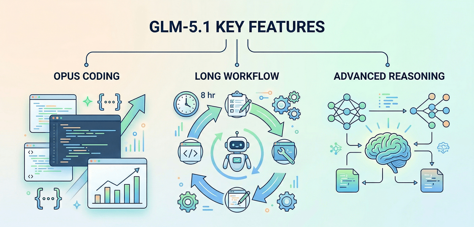 - 核心功能: GLM 5.1 具备顶尖的编码能力。它能自动执行任务长达八小时,并通过自适应问题解决机制确保工作流顺畅,交付功能完整的结果。