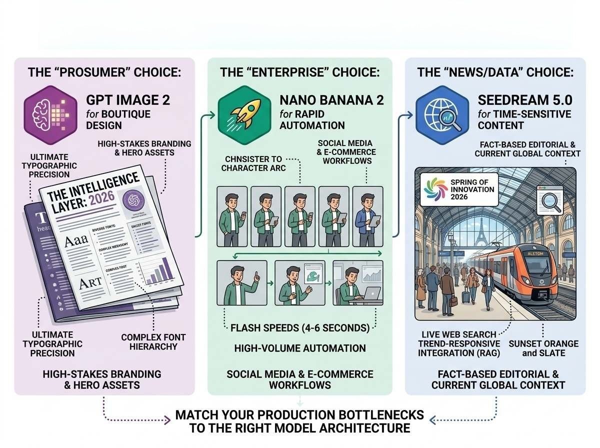 本次测评考察了 2026 年第二季度的三大主流系统:GPT Image 2(推理引擎)、Nano Banana 2/Pro(效率领跑者)以及 Seedream 5.0(搜索增强型预言机)。