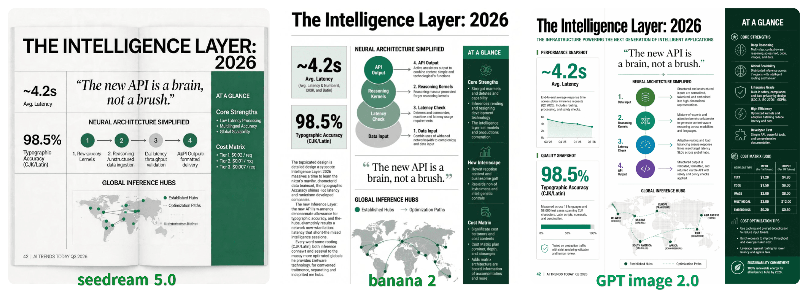 - GPT Image 2: 你可能会发现这是唯一可用于生产的方案。它是唯一能够完美渲染每个单词——从“Intelligence Layer”标题到小字“AI TRENDS TODAY Q3 2026”——且拼写 100% 正确、无字符重叠的模型。数字“~4.2s”和“98.5%”清晰且逻辑性地置于各自的 UI 容器中。它成功结合了粗体无衬线标题和优雅的衬线引语,在整个版面中保持了独特的“字体辨识度”。尽管输出完美,但生成时间最长,约为 40-60 秒。
